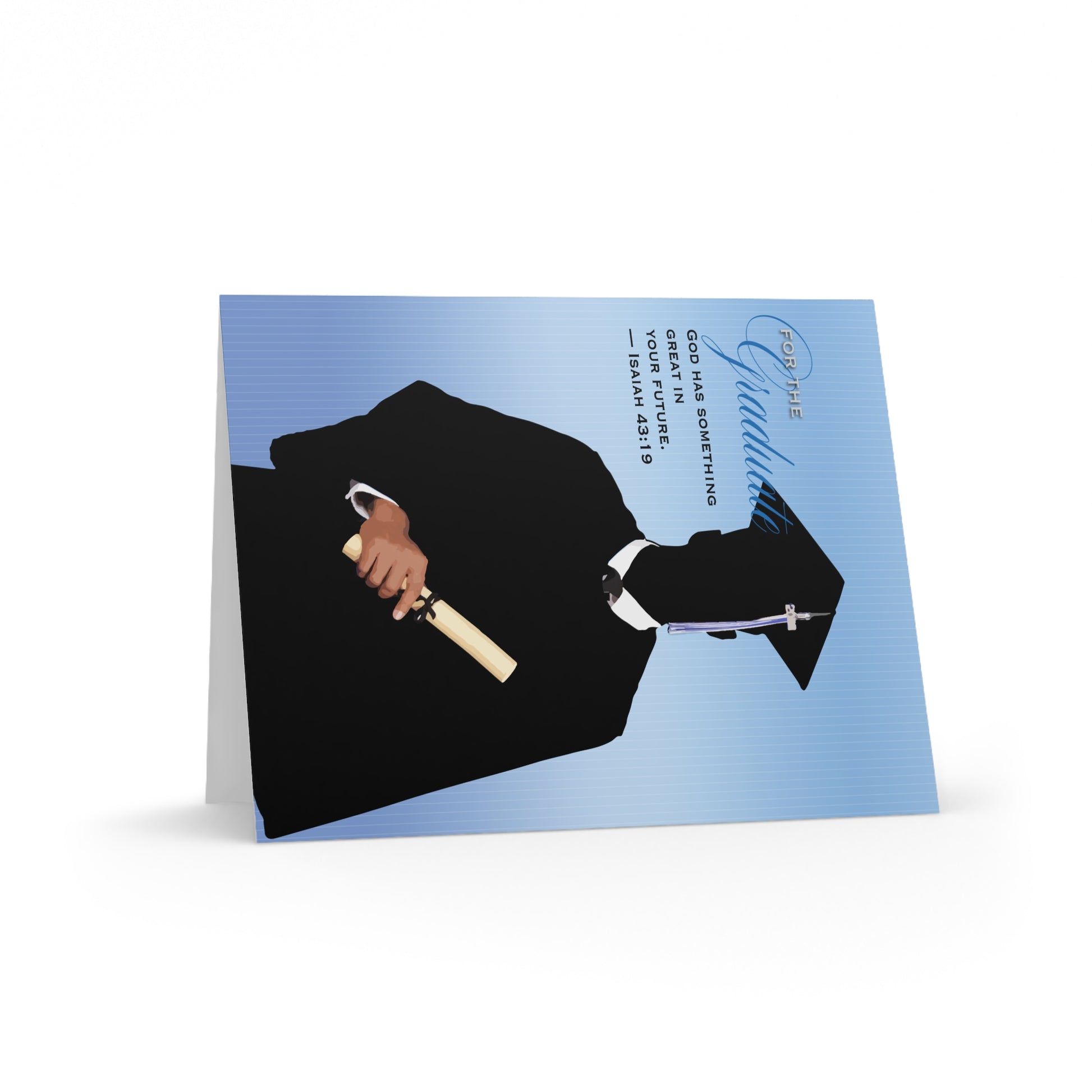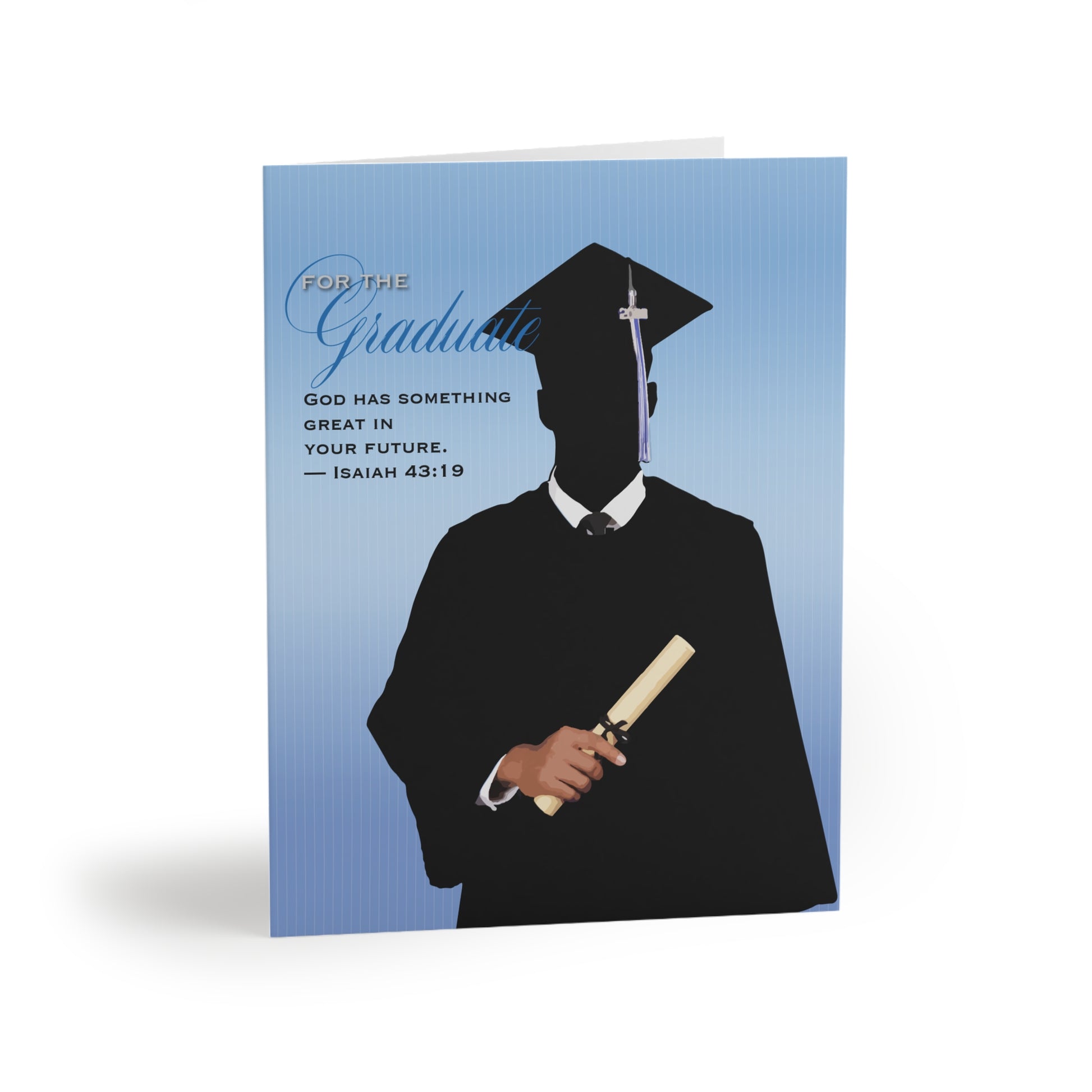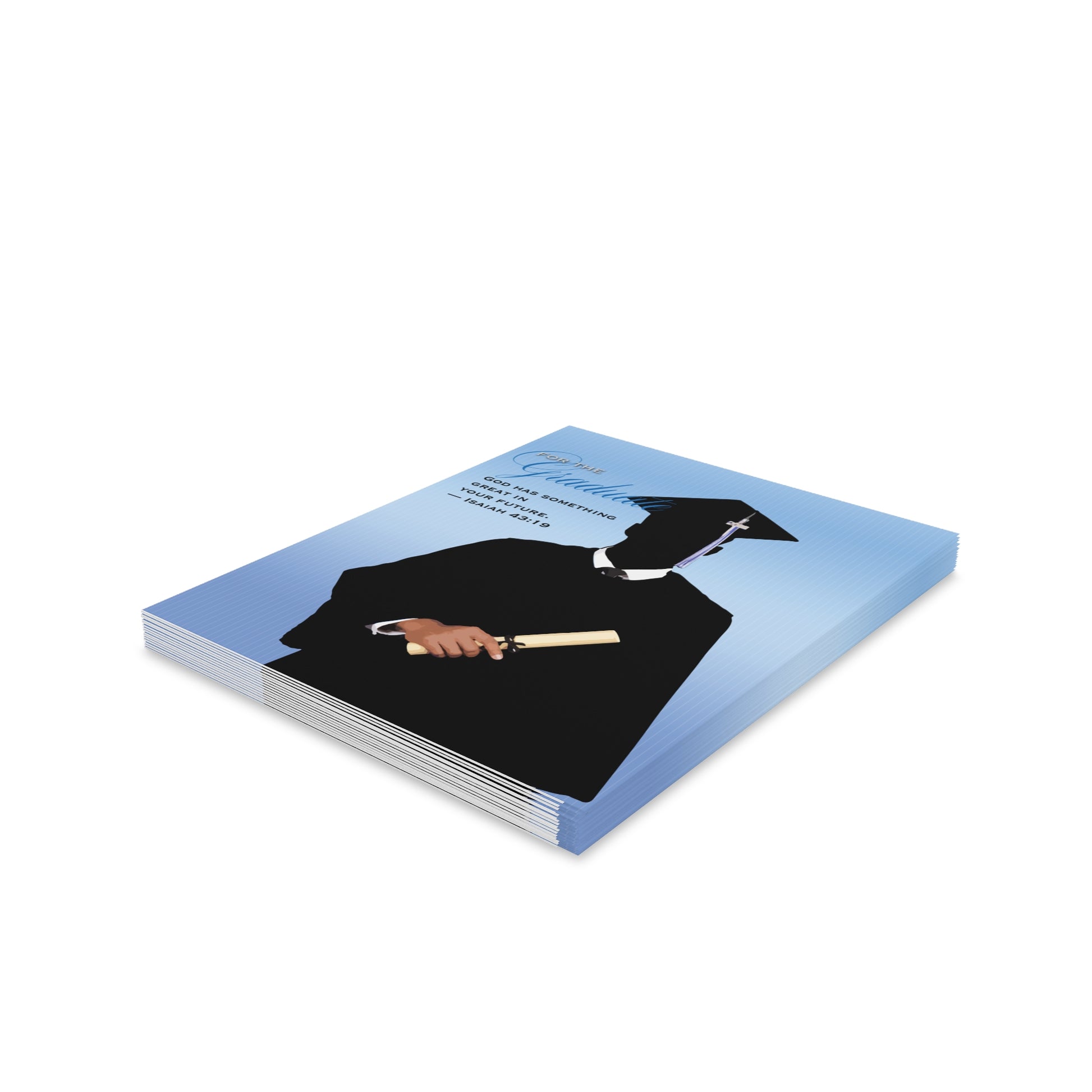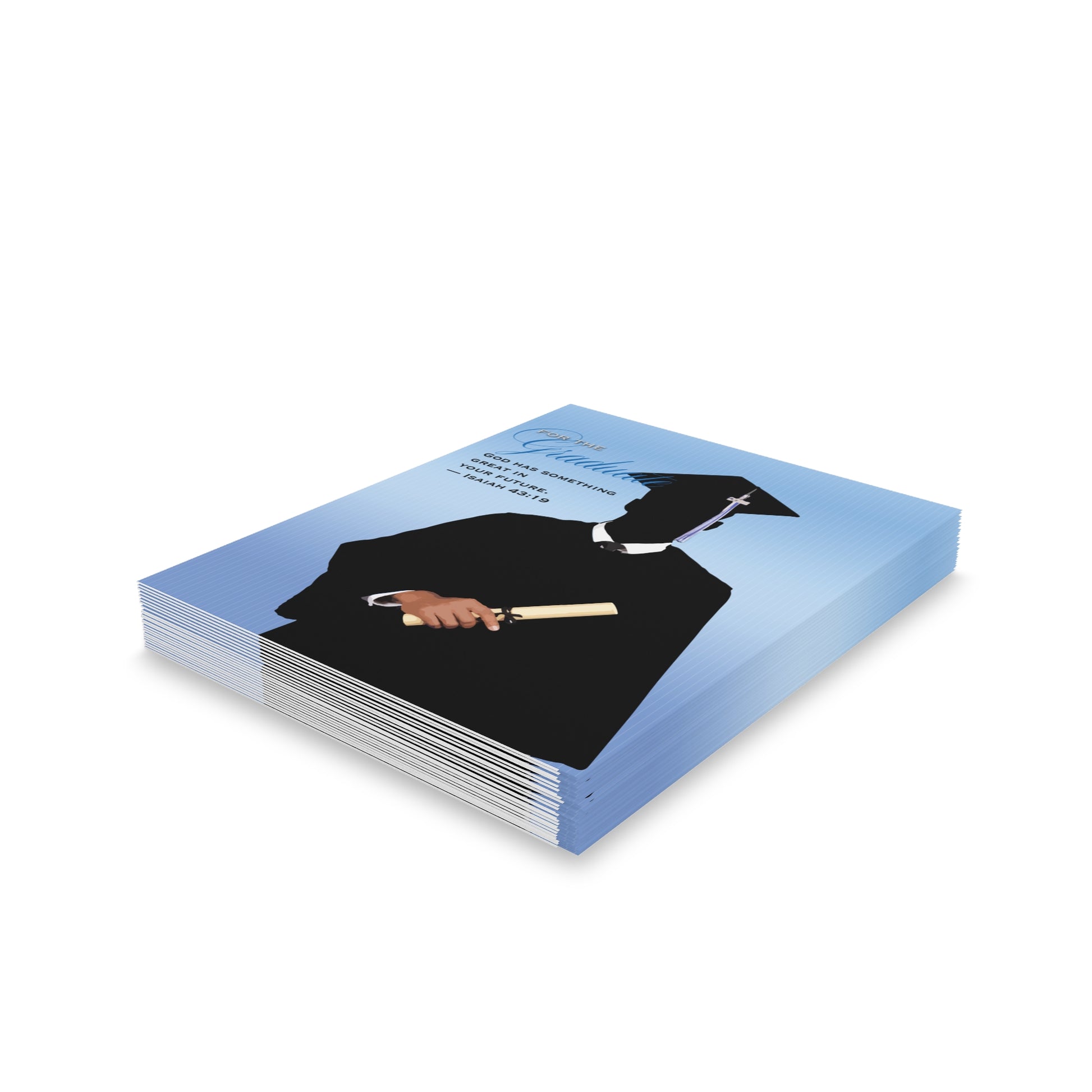 Celebrate the men who are graduating this season. Printed on uncoated cardstock. Available in 8-packs, 16-packs, and 24-packs - each pack comes with matching white envelopes. Inside Message: "There are endless possibilities in your future. Believe in who He has called you to be and have faith for the journey ahead. Congratulations!"
